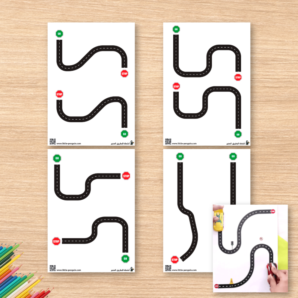 دحرجة السيارة: سيقوم طفلك بدحرجة سيارة صغيرة أو أي لعبة بعجلات (مثل الدمى التي تتحرك أو سيارات اللعب) على المسار المرسوم في الورقة.