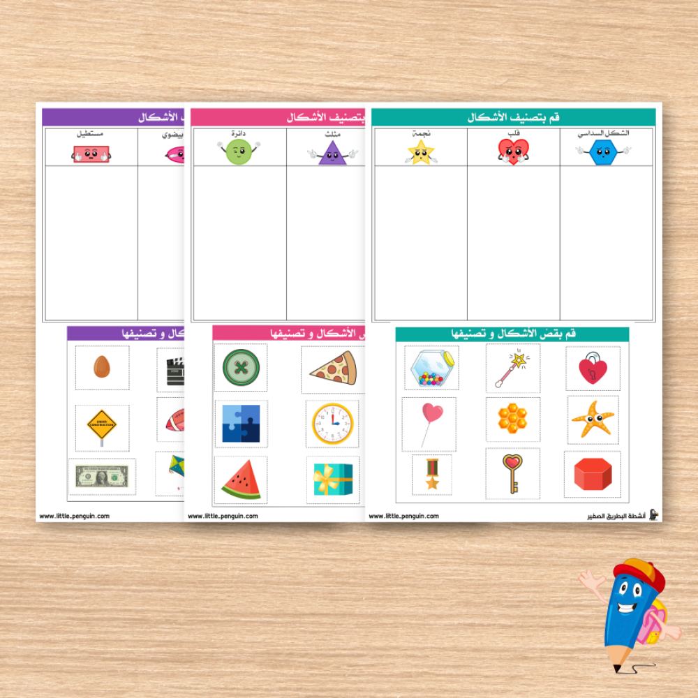 يقوم الطفل بقص الأشكال أو الصور الموجودة أسفل كل ورقة نشاط، ثم يُصنّفها ويُلصقها في المكان المخصص لها حسب الشكل الهندسي المناسب. الصور المستعملة في النشاط هي أمثلة حقيقية من الواقع، مما يجعل التعلُّم أكثر قربًا وفهمًا لعالمه المحيط.
