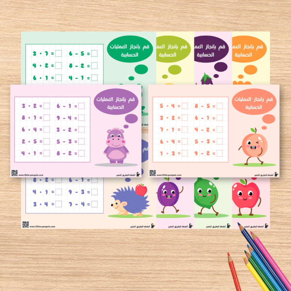 يتضمن النشاط أوراق عمل تحتوي على تمارين متنوعة في الجمع والطرح. يطّلع الطفل على كل عملية حسابية، ثم يقوم بحساب الناتج وكتابته في الخانة المخصصة له. التنوع في الأشكال والأسئلة يجعل التجربة غير مملة ويُشجع الطفل على مواصلة التعلم بحماس.