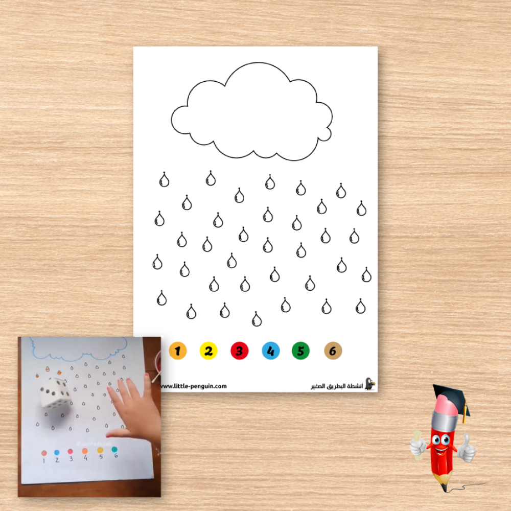يتكوّن النشاط من غيمة تحتوي على قطرات مطر مرقّمة. يقوم الطفل برمي مكعب الأرقام، ثم يلوّن قطرة المطر التي تحمل نفس الرقم باللون المناسب. يستمر الطفل في رمي المكعب وتلوين القطرات واحدة تلو الأخرى إلى أن يُتمّ النشاط بالكامل.