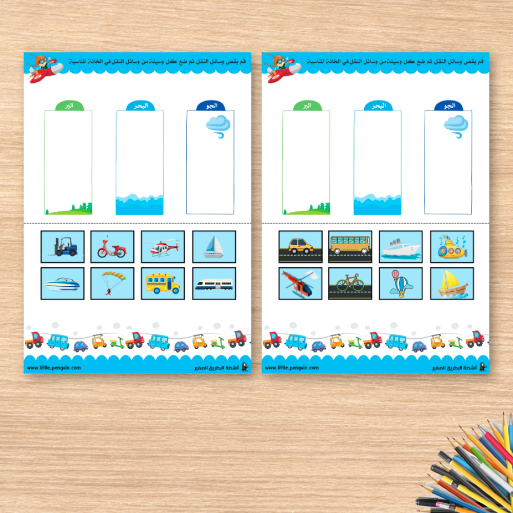 💡 اقتراح إضافي: يمكن للطفل أن يقوم بشرح السبب وراء تصنيفه لبعض وسائل النقل في فئات مختلفة، مما يعزز من مهاراته في التعبير الشفهي والتفكير النقدي.