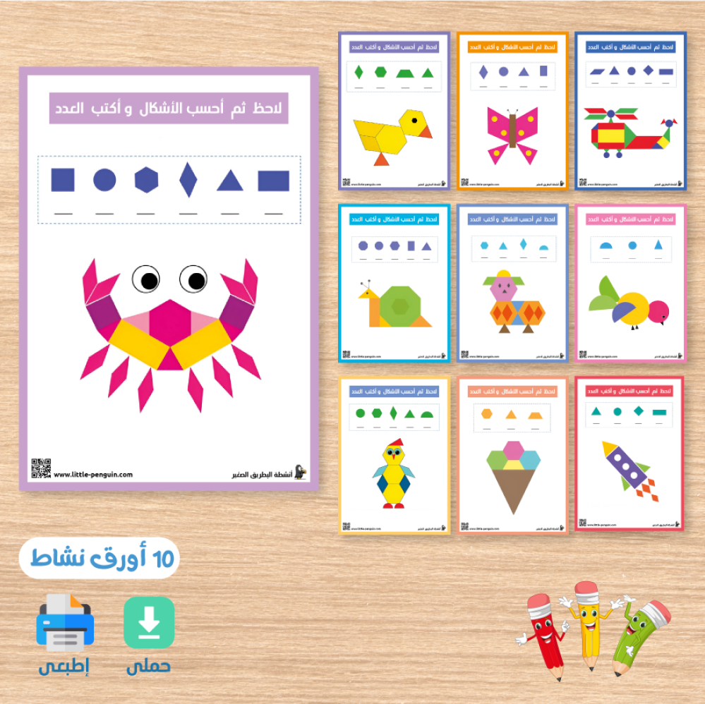 تم تصميمه برسمة محببة للأطفال تحتوي على أشكال متنوعة، ليقوم الطفل بملاحظتهاو نطقها ،ثم يحسبها و بعدها يكتب العدد الصحيح أمام كل شكل بطريقة ممتعة وبسيطة.