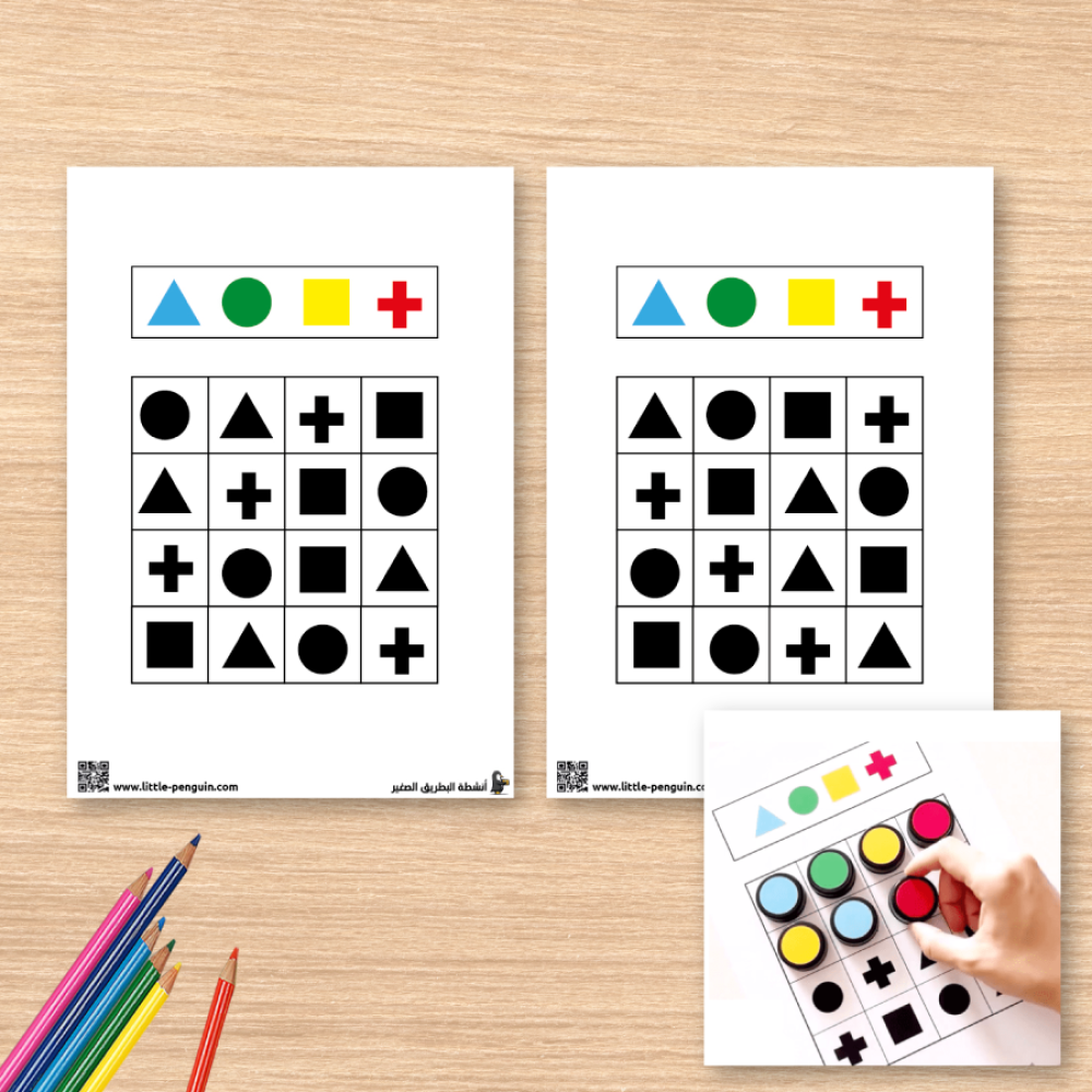 يرى طفلك الأشكال والألوان الموجودة في أعلى ورقة النشاط، والمطلوب منه هو وضع اللون المناسب مكان كل شكل بحيث يتطابق اللون مع الشكل، مستعينًا بما يراه في الأعلى.