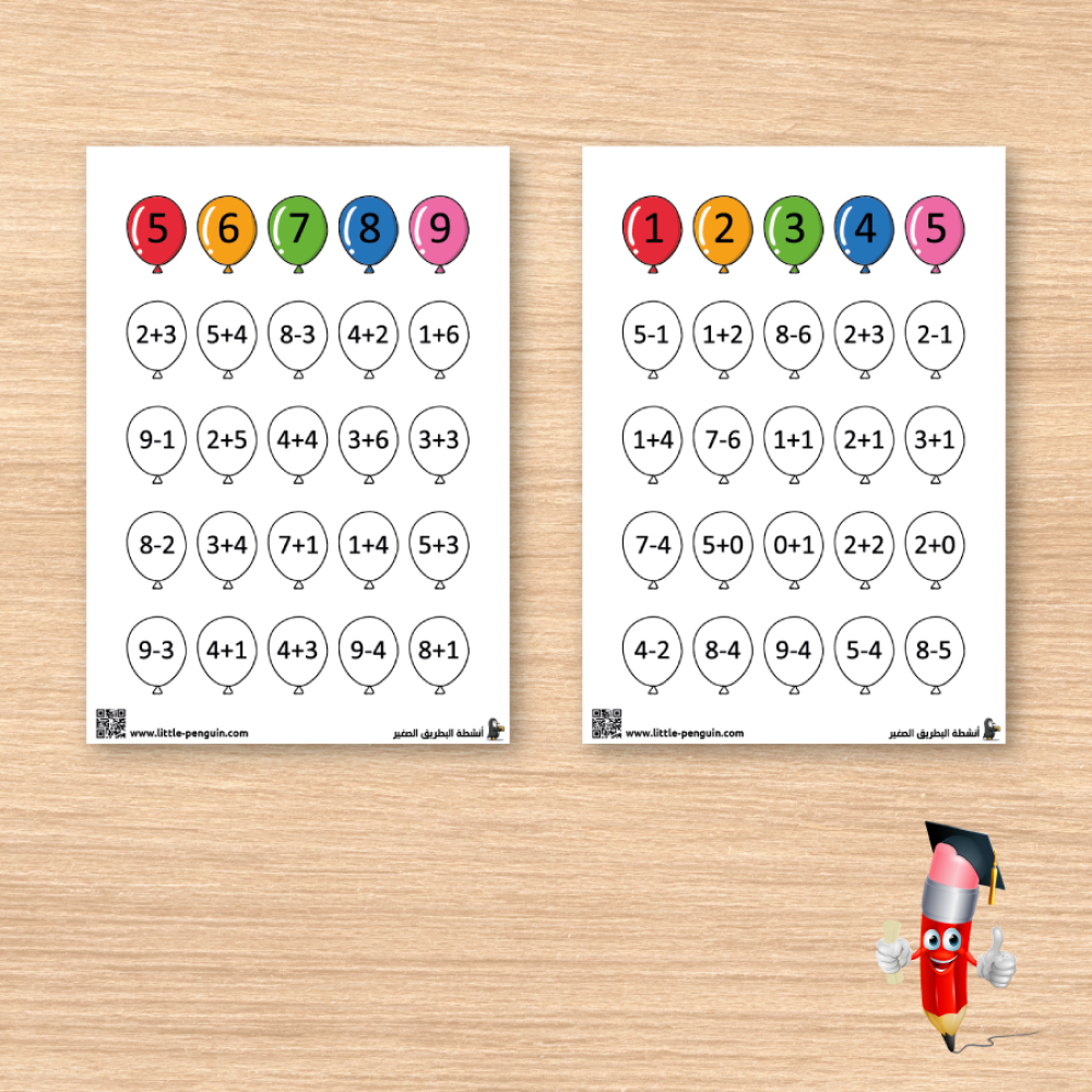 تحتوي ورقة النشاط على مجموعة من البالونات، وكل بالونة تتضمّن عملية حسابية بسيطة. في أعلى الورقة، توجد بالونات بألوان مختلفة وأرقام مقابلة لها. يقوم الطفل أولًا بحساب نتيجة كل عملية داخل البالونة التي في الأسفل ، ثم يطابق الرقم الناتج مع اللون المناسب له ، ويقوم بتلوين البالونة بذلك اللون. وهكذا يتنقل من عملية لأخرى، ممّا يعزز قدراته الحسابية بطريقة ممتعة وبصرية.