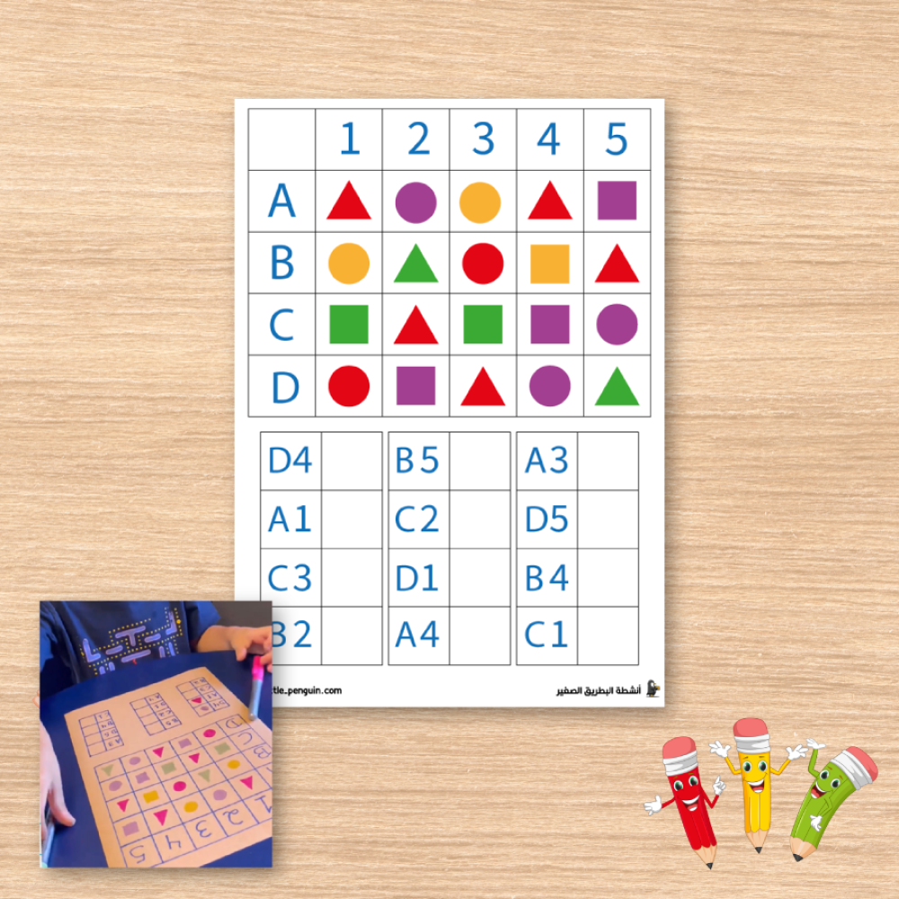 تحتوي ورقة النشاط على جدول في الأعلى يضم أرقامًا أفقية وأشكالًا ملونة عمودية، وفي الأسفل توجد جداول التحديات. المطلوب من الطفل هو ملاحظة التحديات في الجداول، ثم البحث عن الشكل الذي يتناسب مع الرقم المحدد، وأخيرًا رسم الشكل المناسب في مكانه الصحيح داخل الجدول.