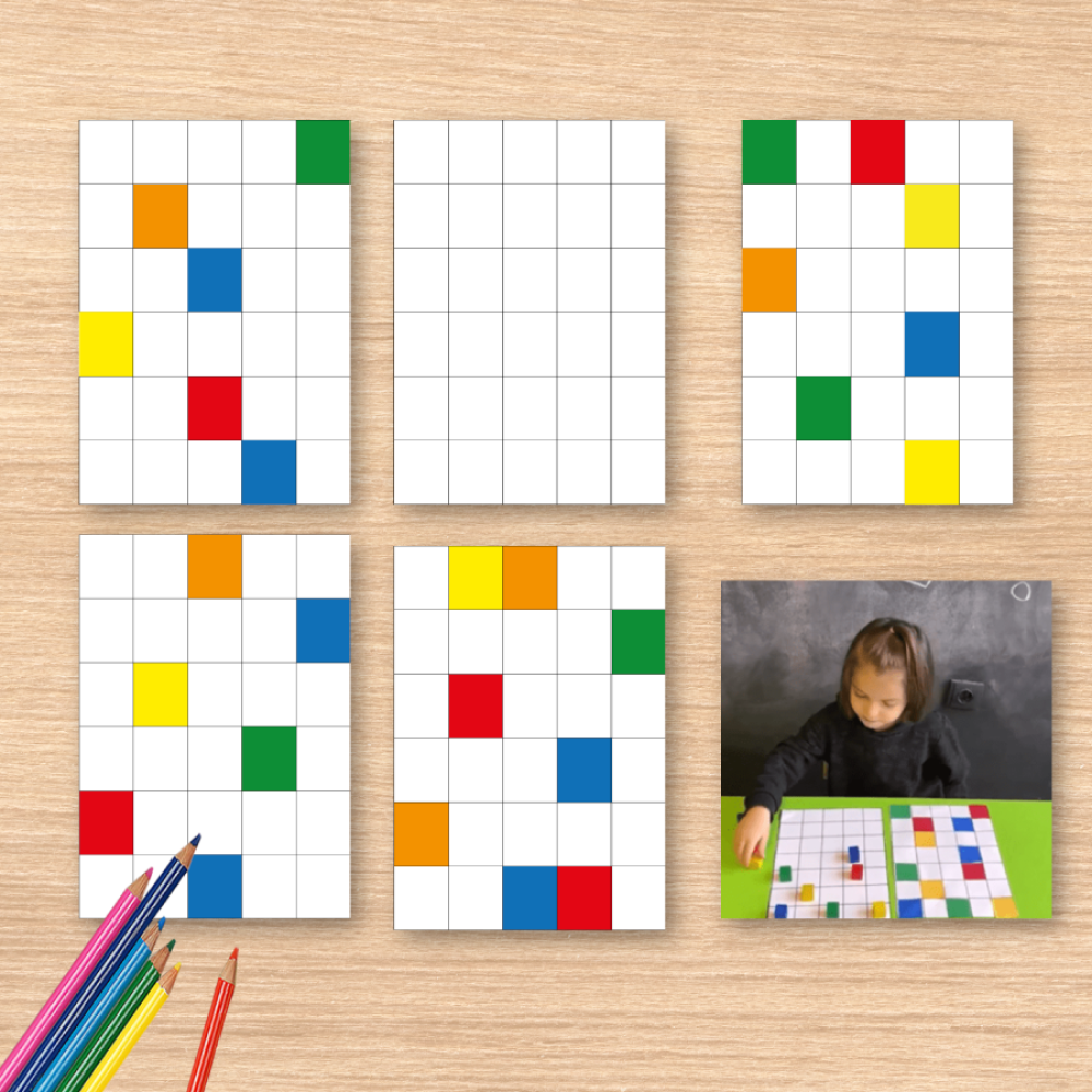 يقوم طفلك بملاحظة الألوان الموجودة في ورقة النشاط، ثم يضع مكعبات أو أقراص أو أي أدوات صغيرة أخرى في المكان الذي يتطابق مع كل لون. هذا التمرين يعزز قدرته على التركيز، ويقوي ملاحظته للألوان ومهاراته في التفكير المنطقي.