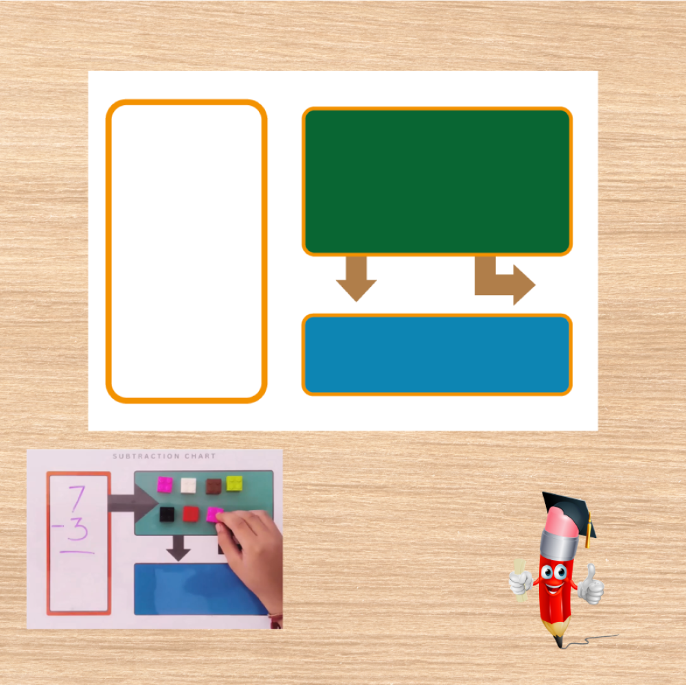 تقوم الأم أو المربية بكتابة عملية حسابية (جمع أو طرح) في الخانة المخصصة على ورقة النشاط، ثم يُطلب من الطفل استخدام مكعبات الليغو أو الأقراص أو أي أدوات تفاعلية لمساعدته على فهم العملية الحسابية. من خلال العد البصري واللمسي، يقوم الطفل بوضع العدد الصحيح من الأدوات، ثم يُجري العملية بنفسه ويكتب الناتج في خانة النتيجة.