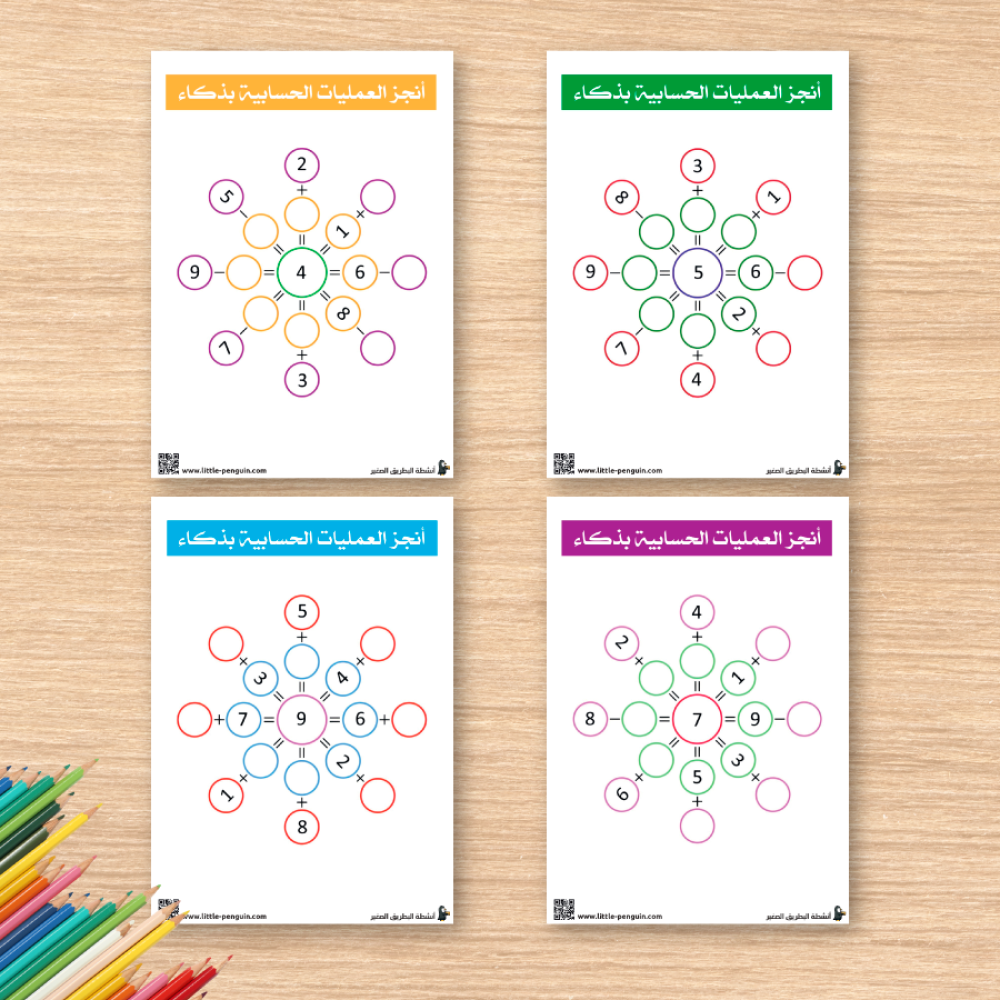 كل ورقة تحتوي على مجموعات من التمارين الحسابية، بحيث يقوم الطفل بحلّ عملية جمع و عملية طرح، والذكاء يكمن في أنه يجب أن يصل في كل مرة إلى نفس النتيجة. هذا النوع من الأنشطة يعزز قدرة الطفل على الموازنة بين العمليات وفهم العلاقات العددية بطريقة ممتعة وتدريبية.