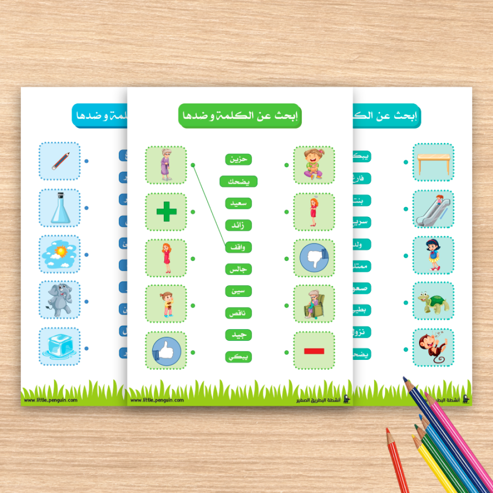 – ثم يبحث عن ضد كل كلمة، ويقوم بتوصيلها كذلك، ليُكوِّن سلسلة لغوية متكاملة تجمع بين الكلمة وصورتها وضدها.