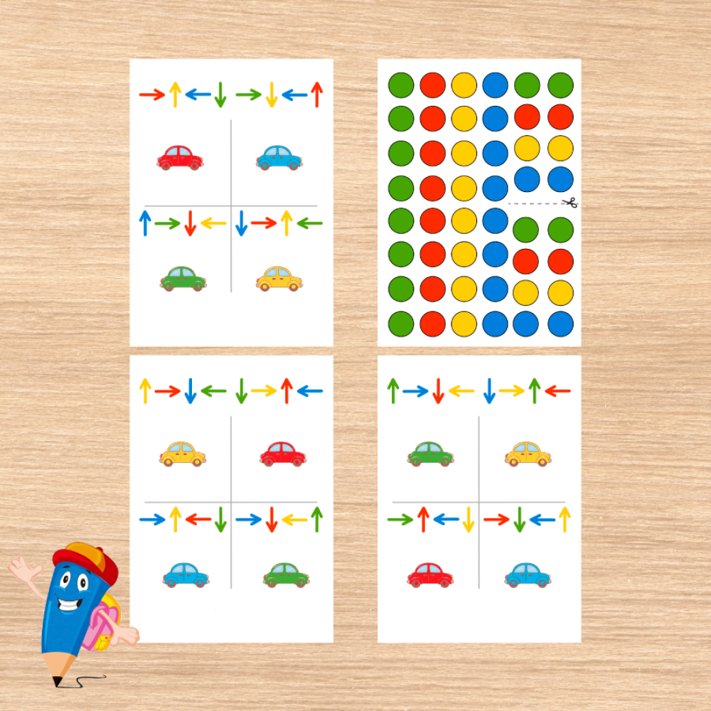 يتكوّن النشاط من مجموعة أوراق تتضمن تحديات مختلفة بواسطة صور السيارات المحببة للأطفال ، بالإضافة إلى ورقة منفصلة تحتوي على أقراص يجب قصّها قبل بدء النشاط. يقوم الطفل بملاحظة الاتجاهات السيارات الملوّنة في ورقة النشاط، ثم يضع الدائرة ذات اللون المناسب في المكان الصحيح حسب كل الإتجاه و اللون، معتمدًا على تركيزه وفهمه للمطلوب.