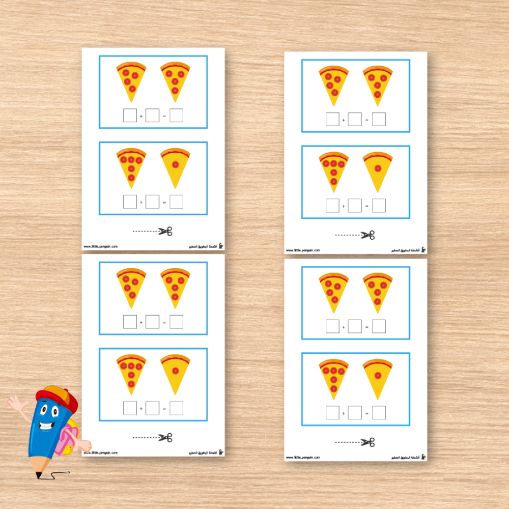 تحتوي ورقة النشاط على بطاقات بها مثلثات بيتزا، ويختلف عدد حبات الطماطم في كل مثلث. يُطلب من الطفل عدّ حبات الطماطم في كل مثلث، ثم جمعها معًا لإيجاد النتيجة الصحيحة. على سبيل المثال، إذا كان أحد المثلثات يحتوي على 2 من الطماطم والمثلث الآخر على 4، فالمطلوب هو إنجاز العملية: 2 + 4.